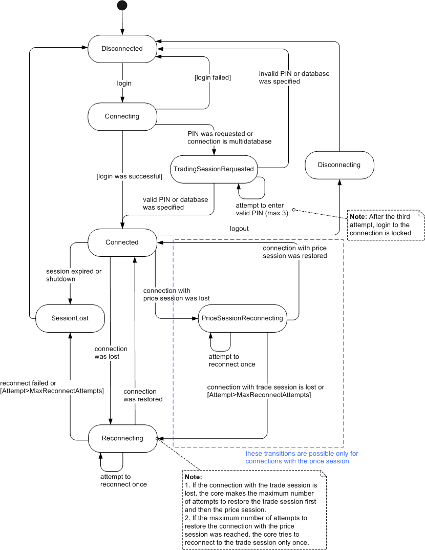 was reached (currently 20) The core is attempting to restore the connection with the trade session. From this status, the session can be transferred to one of the following statuses: Reconnecting For connections with the price session: Connected SessionLost |