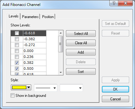 - Show in background: if the check box is selected, the Fibonacci channel is shown