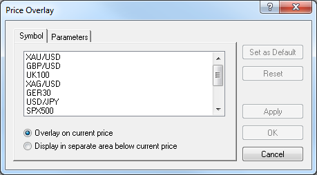 - Display in separate area below current price: if the option is clicked, the price overlay is to be displayed in a separate area below the current chart.