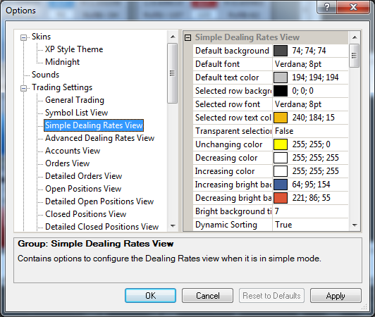 - In the left area of the Options dialog box, click the option group for which you want to change a font setting, for example, Simple Dealing Rates View.