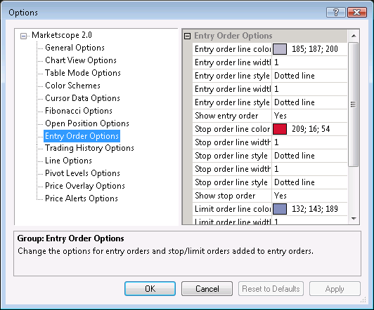 This section describes how to change the options for lines of stop/limit orders added to an entry order.